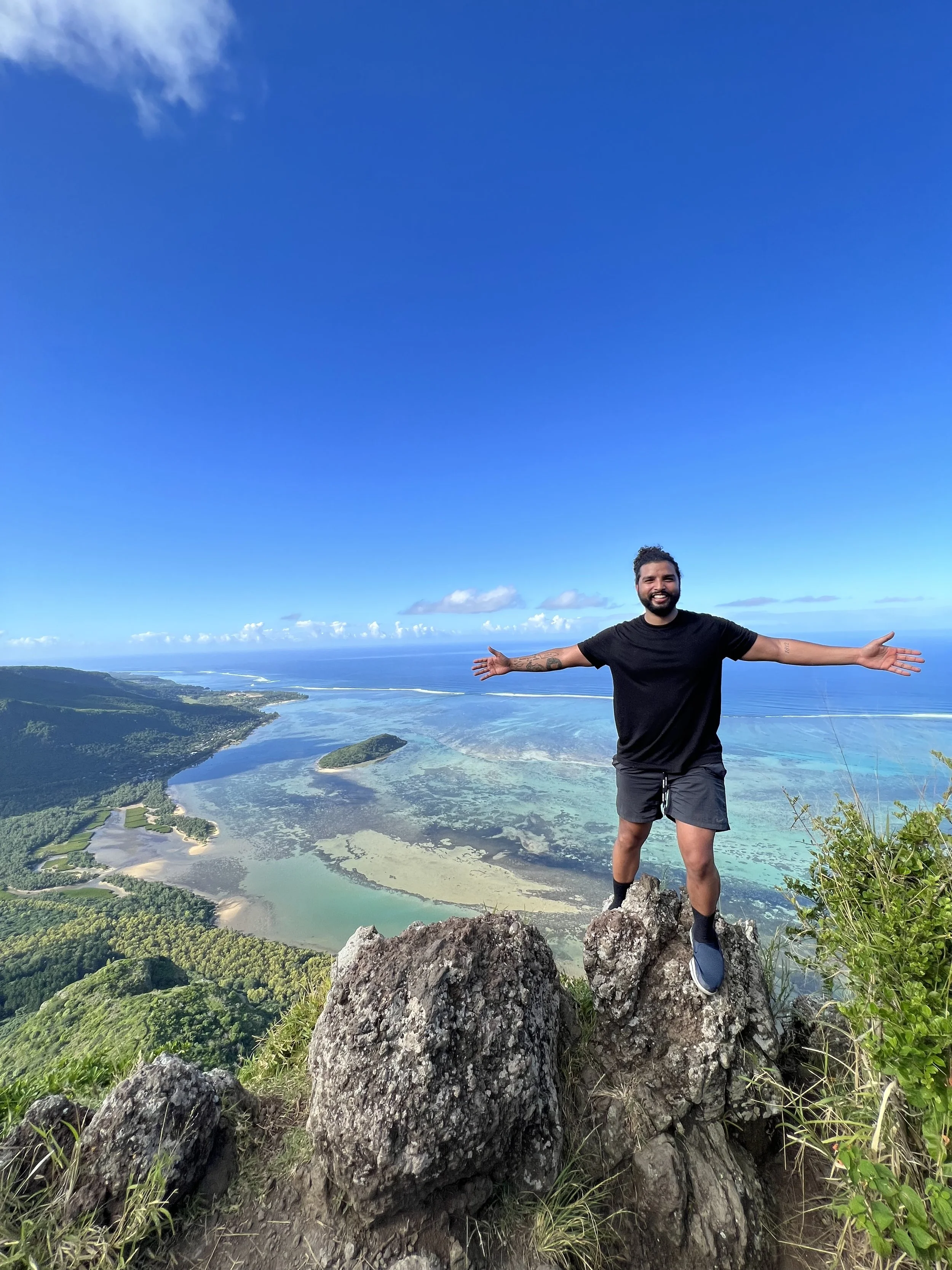 The resort had to reschedule my original plans, so instead of a catamaran tour, I found myself hiking Le Morne Brabant — the iconic peak that overlooks Mauritius’s famed underwater waterfall. Cindy struggled on the way up, even threw up from the intensity, but we made it. We stood at the summit together as the wind whipped through our hair and the sun rose over the island. It was magical. Majestic.